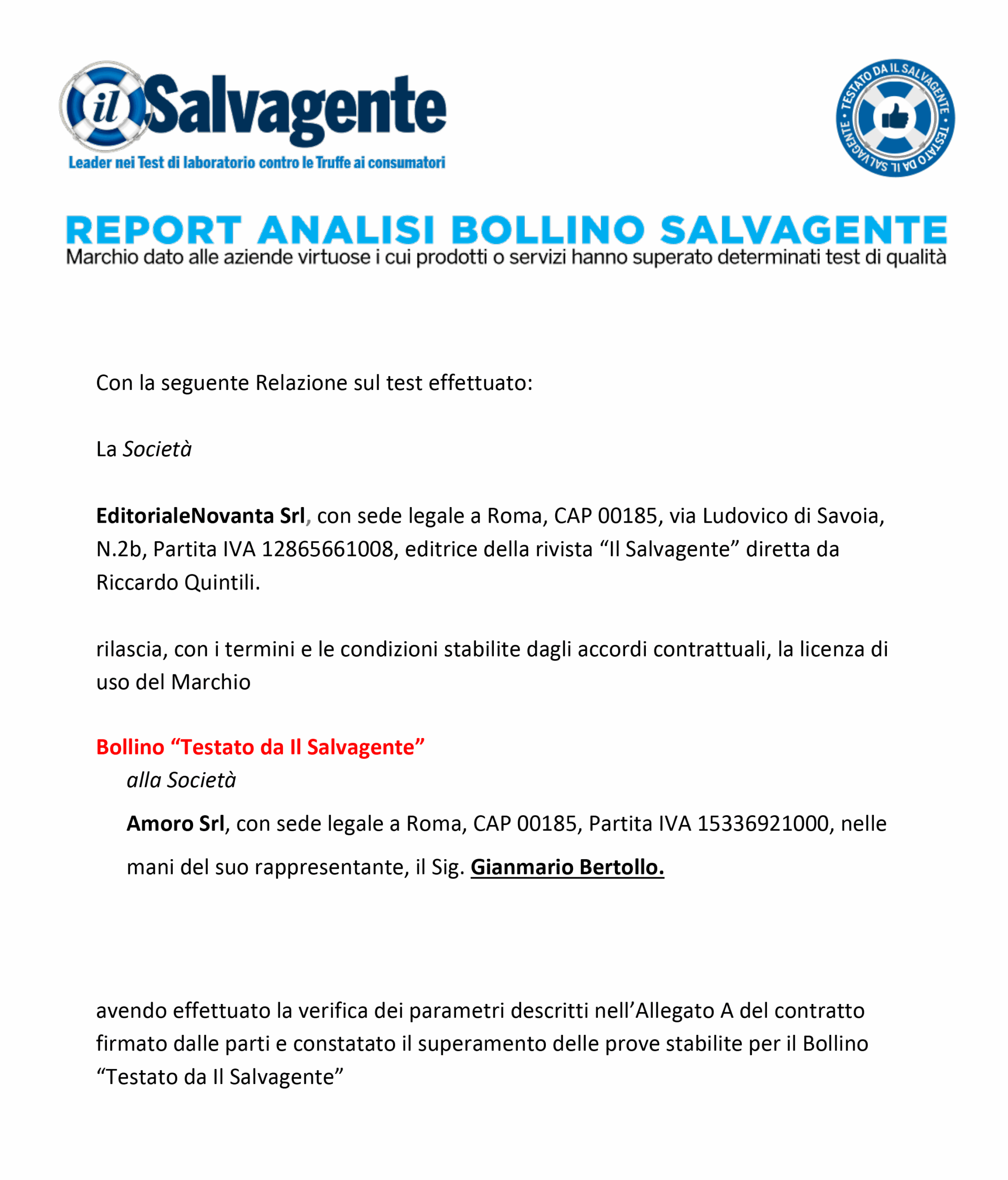 Bollino rilasciato da Editorialenovanta srl il 18/04/2019 sulla base dei risultati delle verifiche indipendenti disponibili su questa pagina, dietro pagamento di una licenza d’uso temporanea valida fino al 18/04/2028.